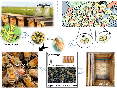 依托国家蜂产业技术体系,操海群团队近年来对我国20个省蜜源主产区的蜜蜂、蜂粮、蜂蜜、蜂蜡、蜂花粉、蜂王浆等样品中农药残留的监测结果发现,以氯虫苯甲酰胺为代表的双酰胺类杀虫剂检出率最高达50%。为明确双酰胺类杀虫剂对蜂群健康的影响,研究团队通过人工饲喂蜂王幼虫,摄入亚致死剂量的双酰胺类杀虫剂,培育成的蜂王在表型上与正常蜂王无明显差异,不论是自然交尾还是人工授精,蜂王都能在工蜂巢房中产卵,但会造成其只产雄蜂不产工蜂,最终引发蜂群崩溃。而正常蜂王在工蜂巢房产工蜂,可维持蜂群健康发展。流式细胞分析证实,处理组蜂王产下的卵均为单倍体(即未受精卵),发育为雄蜂;而对照组蜂王产下的卵均为二倍体(即受精卵),发育为工蜂。这一发现表明,双酰胺类杀虫剂影响了蜂王的生殖过程。结合双酰胺类杀虫剂已知的作用机理,推测该类农药可能通过激活鱼尼丁受体引起肌肉麻痹,影响蜂王产卵过程中精子从受精囊的释放,从而导致受精失败。进一步的田间试验表明,在推荐剂量下施用双酰胺类杀虫剂后2周,蜂群会陆续出现蜂王丢失、产卵停止或仅产雄蜂等现象,2个月后甚至造成蜂群崩溃。研究结果明确了双酰胺类杀虫剂会对蜜蜂蜂王造成隐匿且致命的生殖损伤。这种损伤尽管通过人为更换蜂王可避免对人工养殖蜂群健康发展的影响,但对于野生蜂群却难以实现,造成显著的生态风险。 该项研究挑战了传统以急性毒性评估农药对蜜蜂安全性的认知,为完善化学农药对蜜蜂健康风险评估体系提供了科学依据,对传粉昆虫保护、农药科学管理以及农业绿色可持续发展具有重要理论和应用价值。